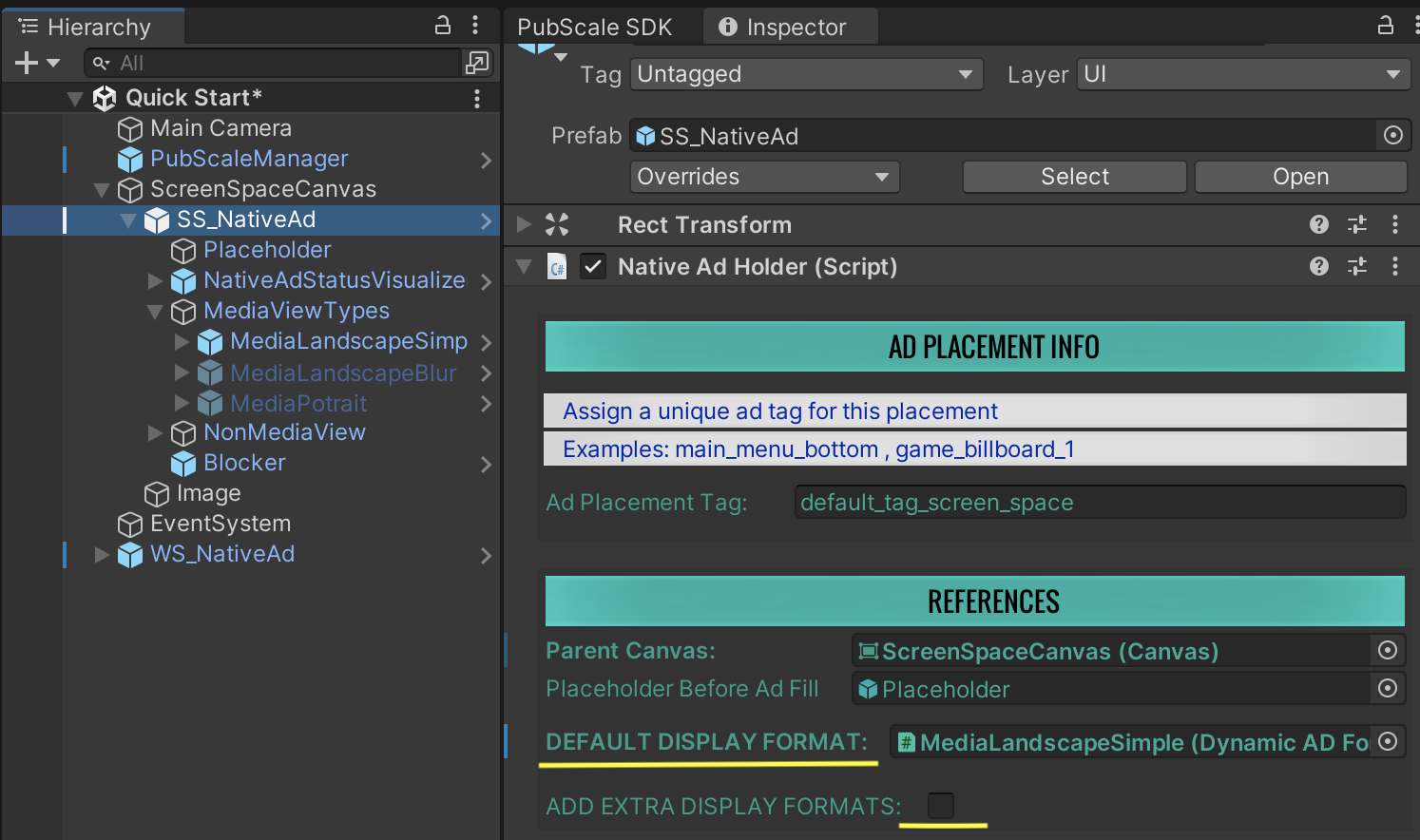 1. Drag and drop the Display Template as a child to the SS\_NativeAd or (WS\_NativeAd > Canvas) object