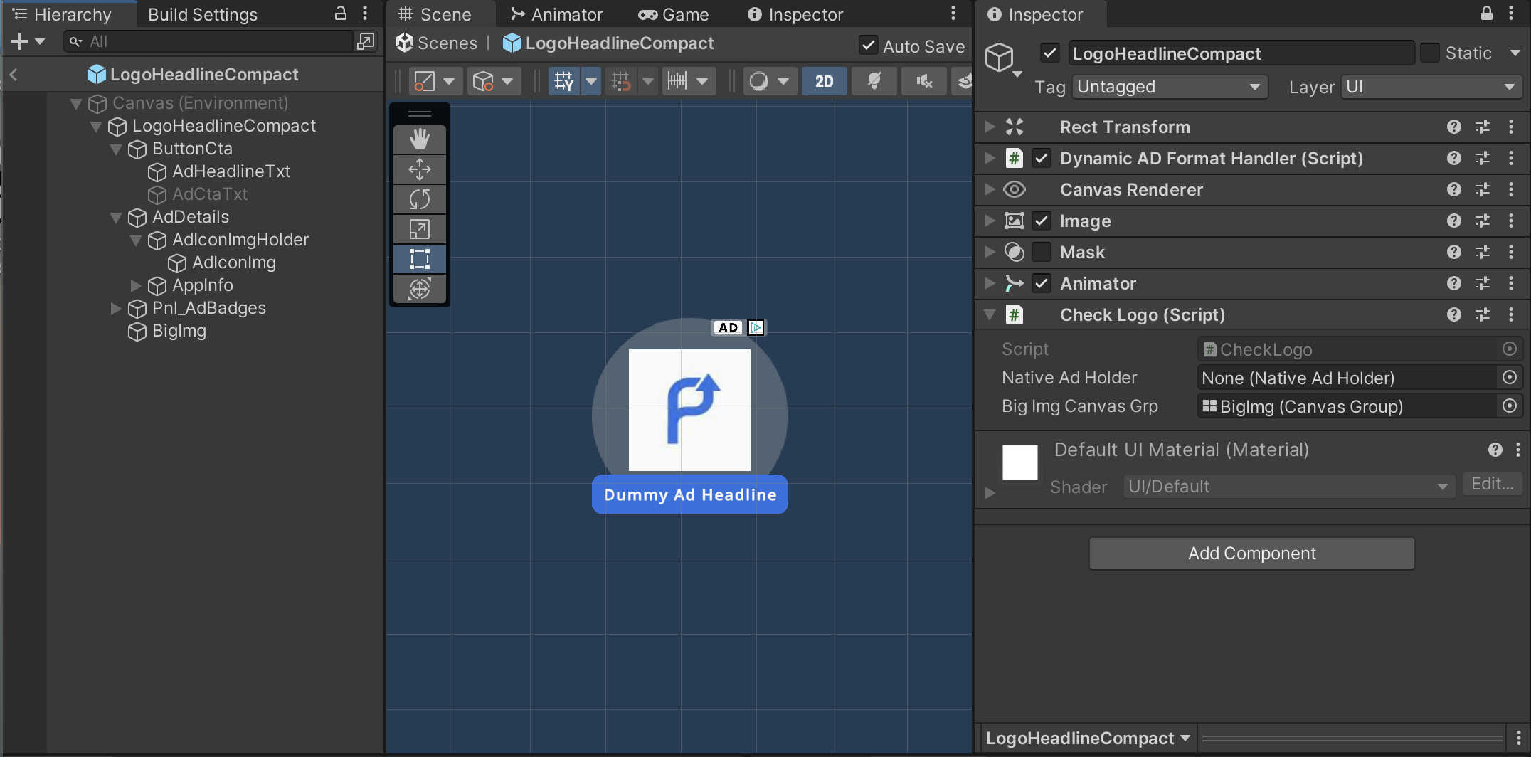 Make sure to assign the reference to NativeAdHolder in the CheckLogo script if using this template