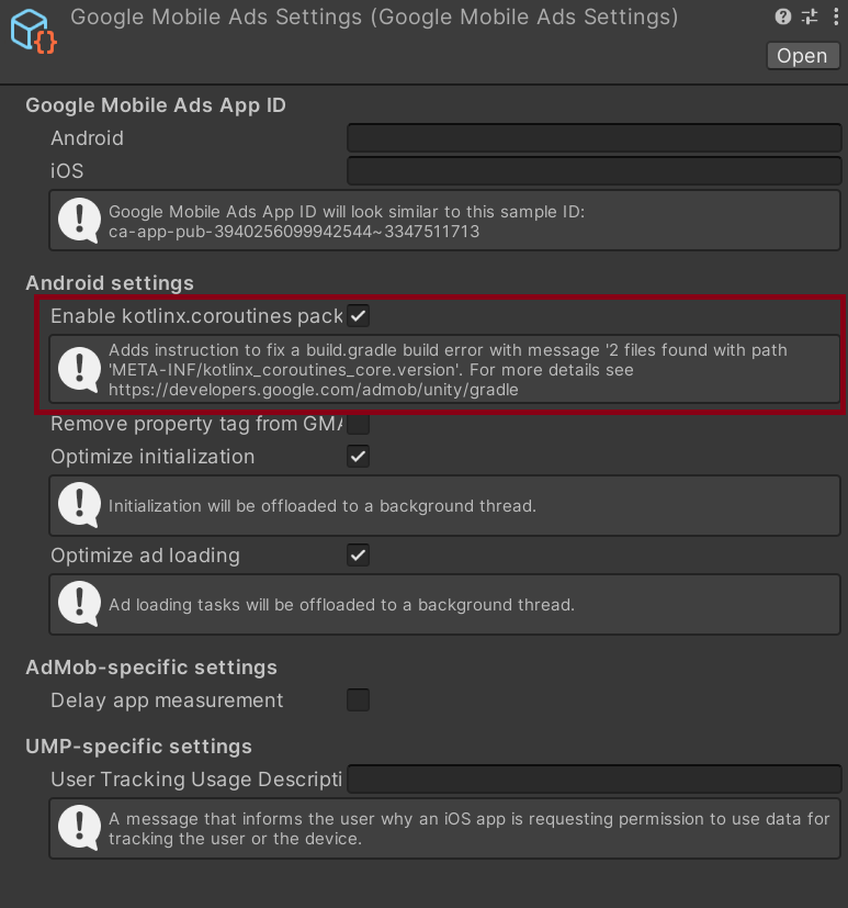 * Make sure `Enable kotlinx.coroutines packaging option` in GMA settings is checked. Learn more about the issue [here](https://stackoverflow.com/questions/77259574/build-error-unity3d-android-kotlinx-coroutines-core-jvm-vs-kotlinx-coroutines-c).
