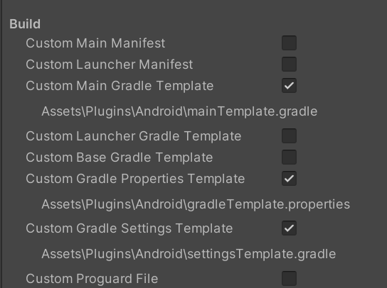 * Under `Player Settings-> Publishing settings,` Check if `Custom Main Gradle Template, Custom Gradle Properties Template and Custom Gradle Settings Template`  are enabled.