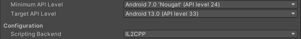 * Make sure the scripting backend is IL2CPP and Target API level is at least 33.