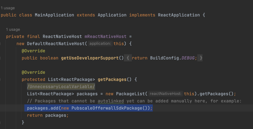 `packages.add(new PubscaleOfferwallSdkPackage());`