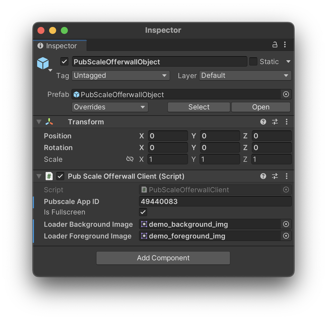 Drag and drop the **PubScaleOfferwallObject prefab** from Assets/OfferWall/Prefab/PubScaleOfferwallObject.prefab in the scene.
