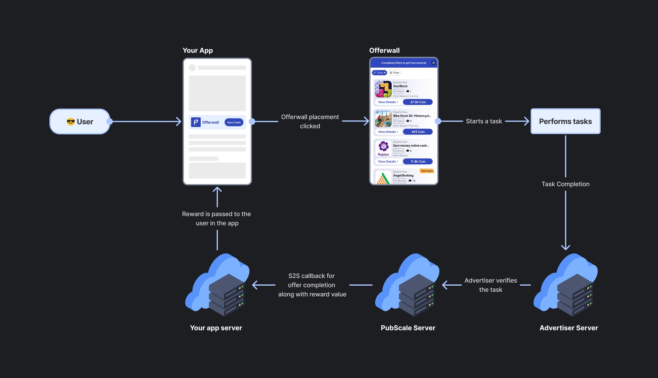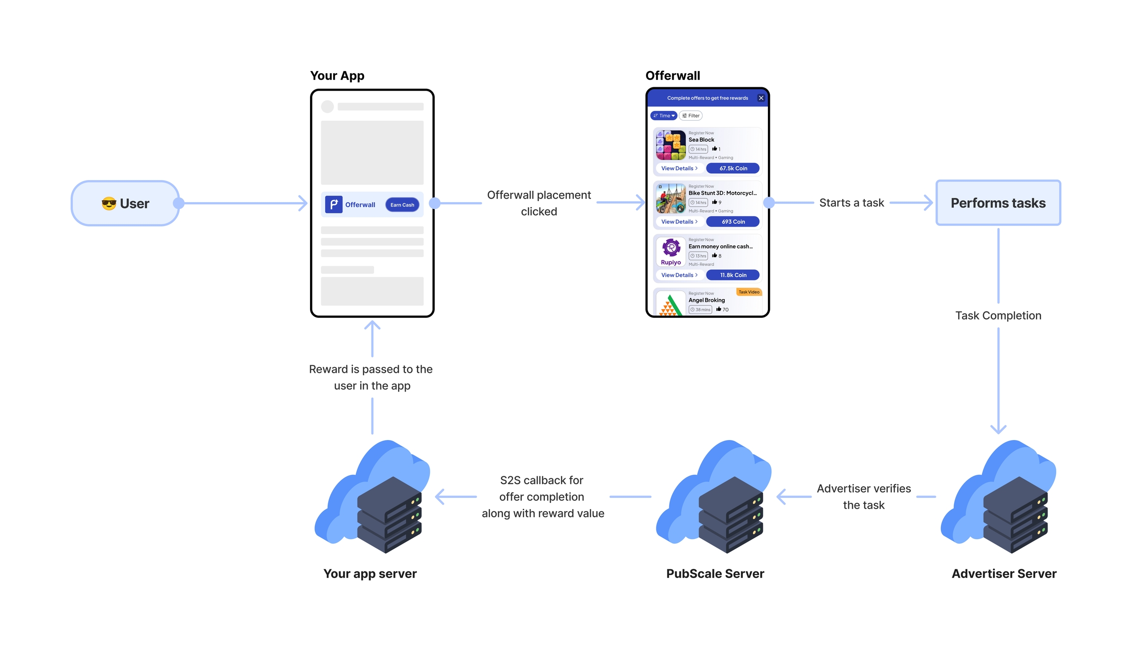 Set up the Server-to-Server (S2S) callbacks to receive instant updates whenever a user completes an offer and earns a reward. When an offer is completed, our server will send a notification to the configured callback URL. This callback provides the necessary information to process and verify the reward for the user in your application. Learn more.