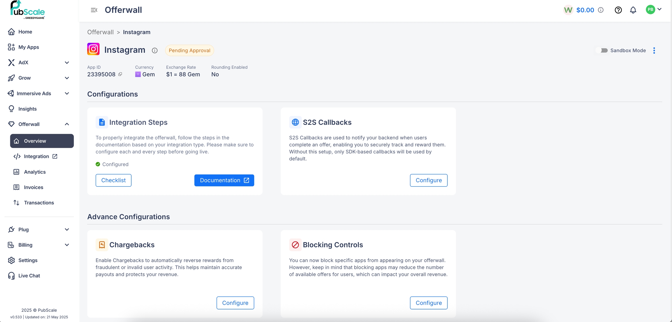 Once you’ve created your app in the dashboard and selected the desired integration type (Android SDK, Web Integration, or API), your app will enter a Pending Approval state.