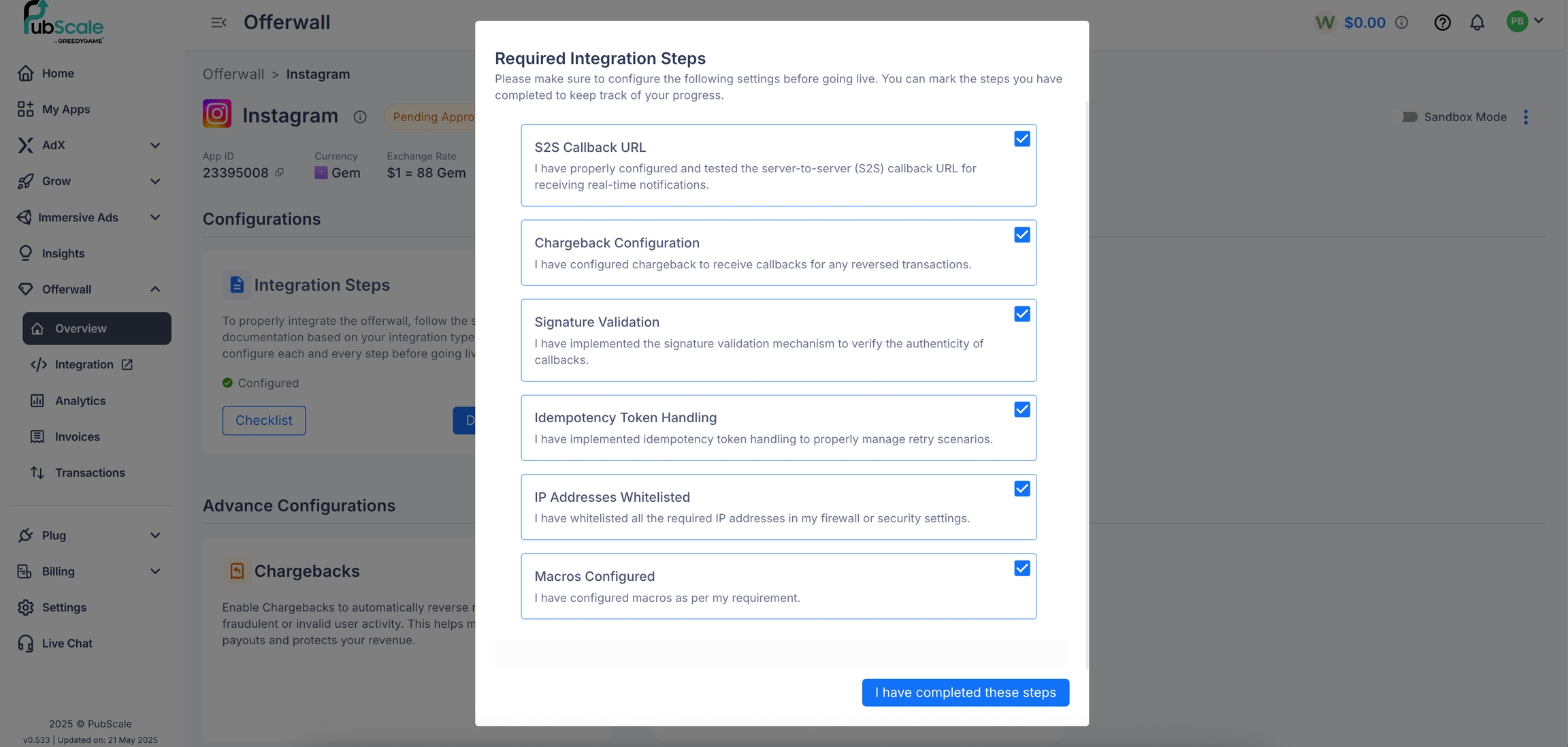 Please make sure to follow the integration checklist to ensure you don’t miss any required steps before going live. Once the app is approved, it may take up to 5 minutes for all changes to fully propagate. If you encounter any errors, please wait for 5 minutes after receiving the approval confirmation.
